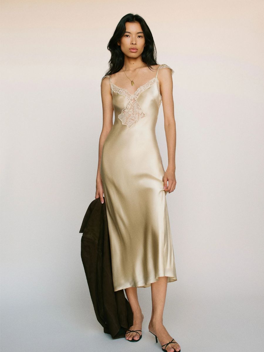 Cream Serafina silk slip dress, €398; www.reformation.com.