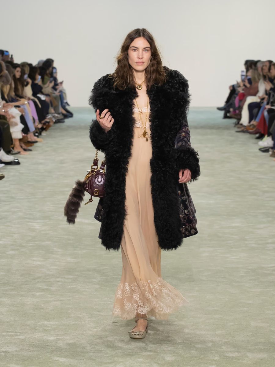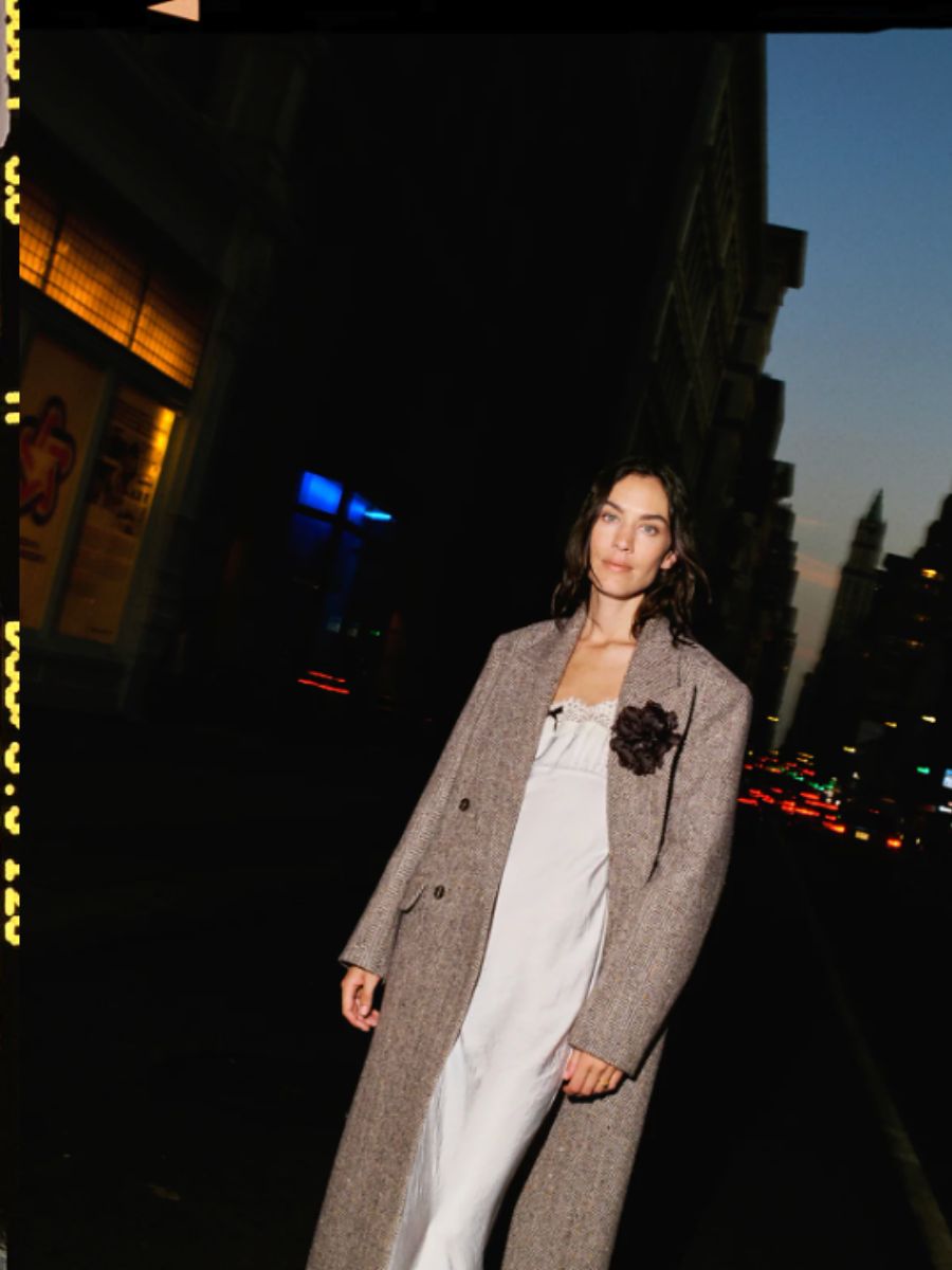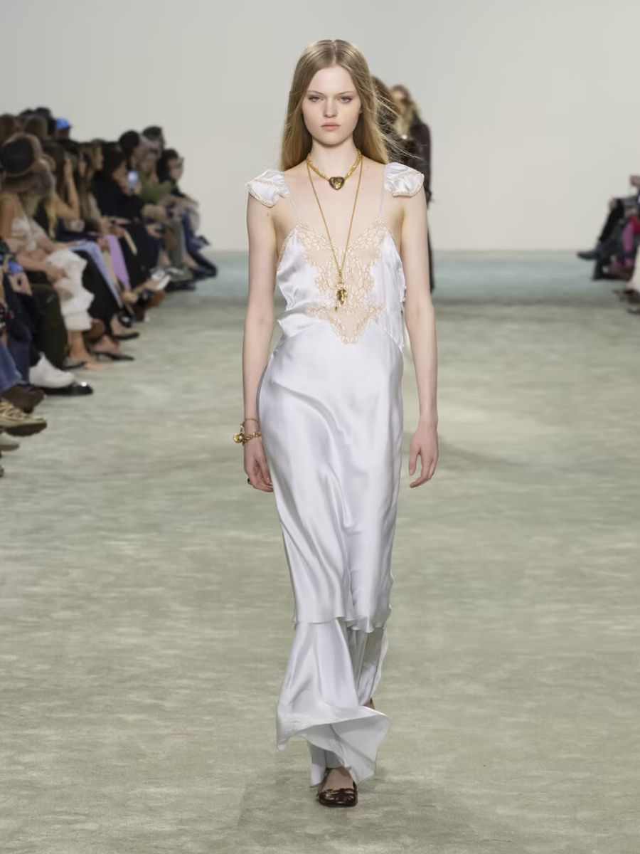The partywear is worth noting, too. Of course, there is a black tuxedo blazer which appears to have an excellent cut (at least, it does in the campaign images where Chung prowls the streets of Soho, perfectly attired to hunt down the next soirée), which is de rigueur for party dressing. However, we couldn’t help but notice the addition of another cool-girl party staple: the slip. The Courtney slip dress (a nod, we’d imagine, to Courtney Love) which comes in black and white, is both a nod to 90s dressing as well as Parisian chic – Chung wore something similar when she modelled in the Chloé AW25 runway show earlier this year, it was also styled with flats and a bohemian pendant chain necklace (see below) – and a toast to Chung’s I’m-with-the-band persona of yore.