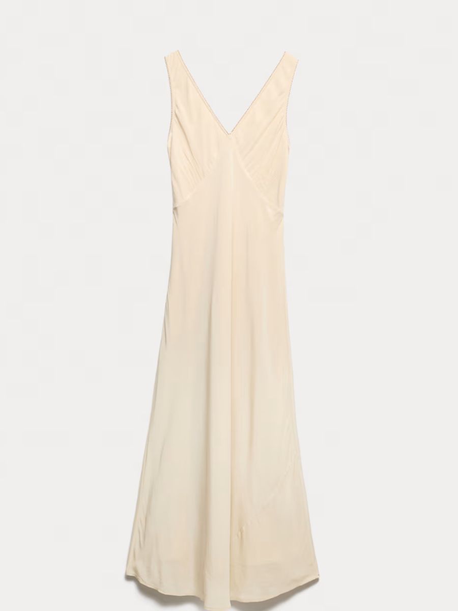 Ecru silk beaded V-neck slip dress, Per Una, €265, at Marks & Spencer.
