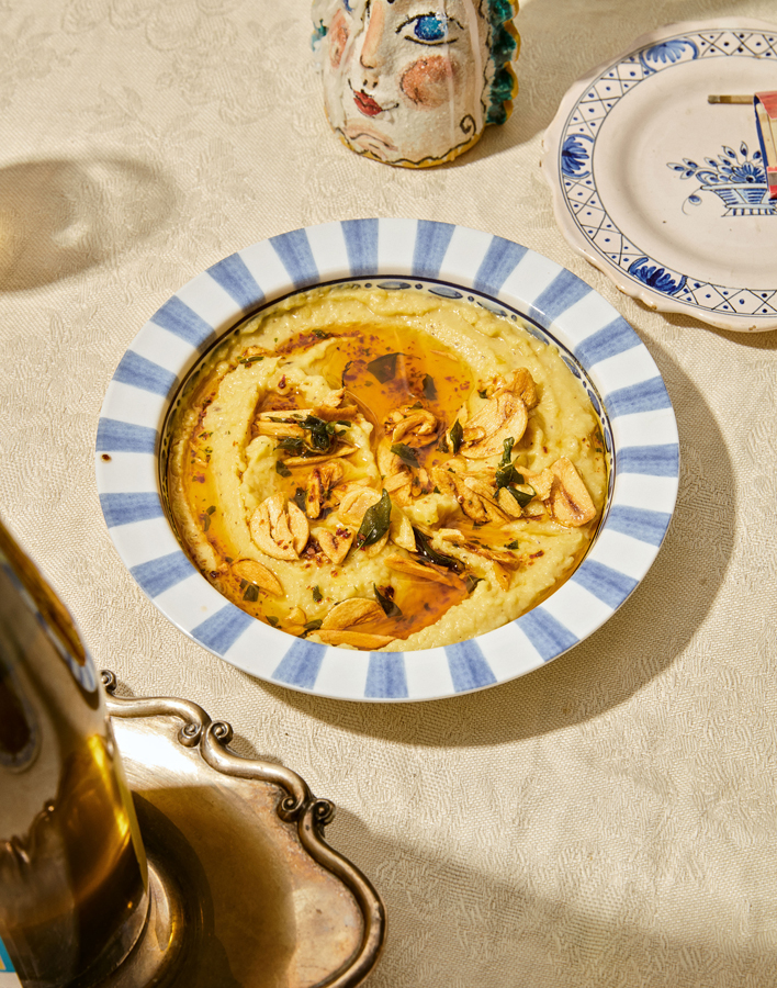 “This is my best interpretation of ‘fava’, the classic Greek dip you’re able to get at any taverna across the country. Each version I’ve had, made with yellow lentils (not favas), lots of lemon, garlic and olive oil, is wonderful, and I love them all. I suspect they’re using a different technique, as the ones I’ve had in Greece were sublimely smooth, and this version is charmingly lumpy (intentional). The best part about this dip is that you don’t need a food processor or blender: The lentils cook in just enough water to fully break them down into mush. Season aggressively, and – if making this ahead – know it’ll firm up as it sits. (You can always thin it out with more lemon juice, olive oil, or a touch of water as needed.)”