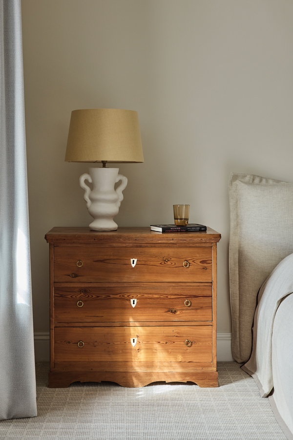 A detail showing the antique chest of drawers and lamp from Dorian, London.