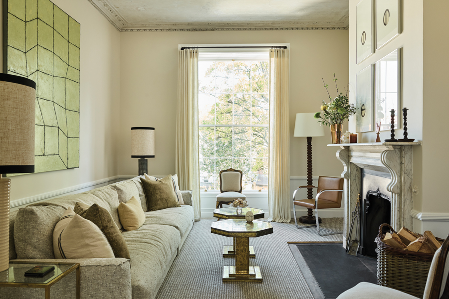 The drawing room, with its extra-long Gervasoni sofa, artwork by Charles Tyrrell and eclectic tables, lighting and decorative pieces, sets a relaxed scene for design consultations as well as downtime. Eoin decided on wall-to-wall sisal and wool carpet (Crucial Trading at TC Matthews) for comfort, and to create a seamless transition to the adjoining carpeted dining room.