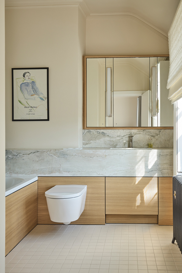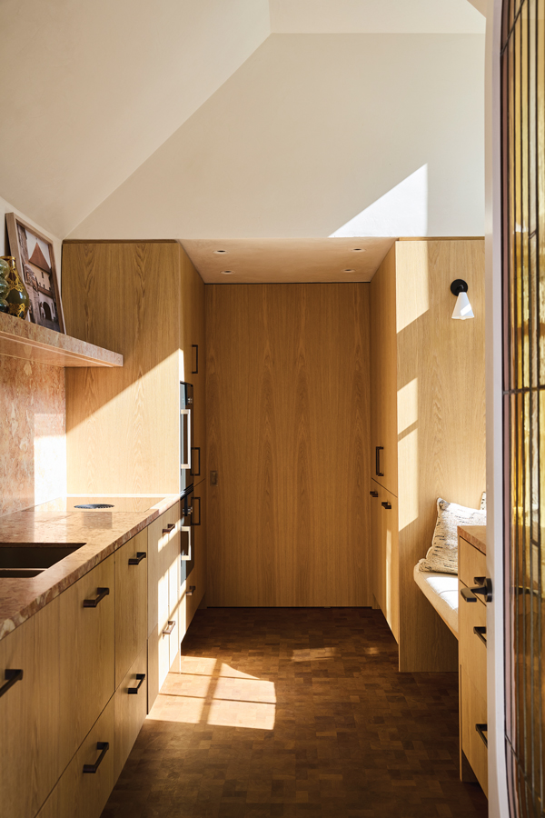 The kitchen is small but brilliantly considered: “We went right up into the roof to create a bigger volume, extending the height of the window to gain more light,” says John. The fitout is very simple and elegant, combining a beautiful window seat, oak cabinetry by Abington and a pinkish fossilised stone by Miller Brothers. The ceiling and walls are in polished plaster by Paul Griffin which, as the kitchen faces east, is highly reflective in morning sunlight. Behind the sliding panel at the end of the kitchen is a utility room.