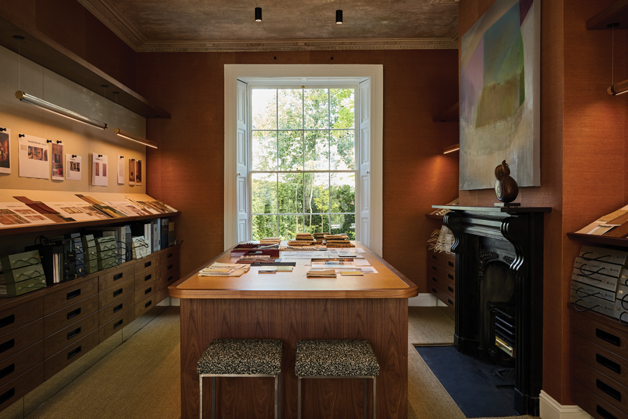 The north-facing gallery and presentation room has burnt orange hemp walls with linen-backed panels for LyonsKelly to display drawings and fabrics. A large walnut worktable, its top surface covered in buttery yellow leather, is top-lit so clients can view samples and materials. In the evening, this space transforms into an intimate room for drinks. The painting over the fireplace is by Tom Climent.