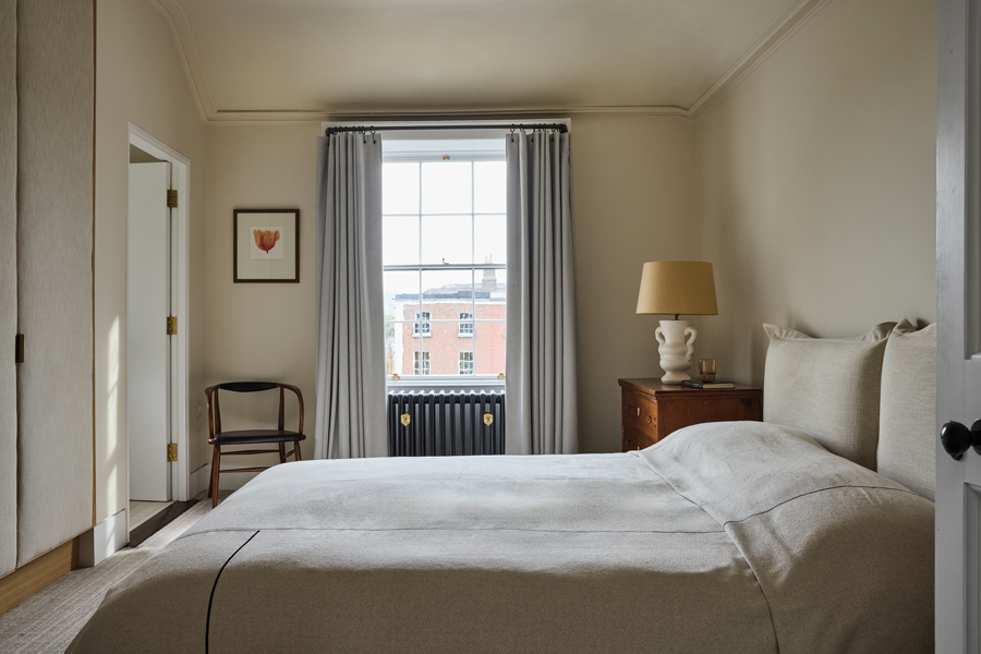 The bed is covered in a cotton and linen bedspread by Maria Fenlon’s Irish brand Enhance. The pale blue curtains in a Holland & Sherry wool were made by Mary Wrynne. The chair is from Killian McNulty.