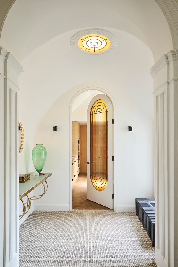 On the return, the bright, domed lobby has become “camp corner”, according to its owners, with a full-on brass table from Soane and mirror and decorative vintage pieces. Five shades of amber glass are used in the new skylight and door to the kitchen.