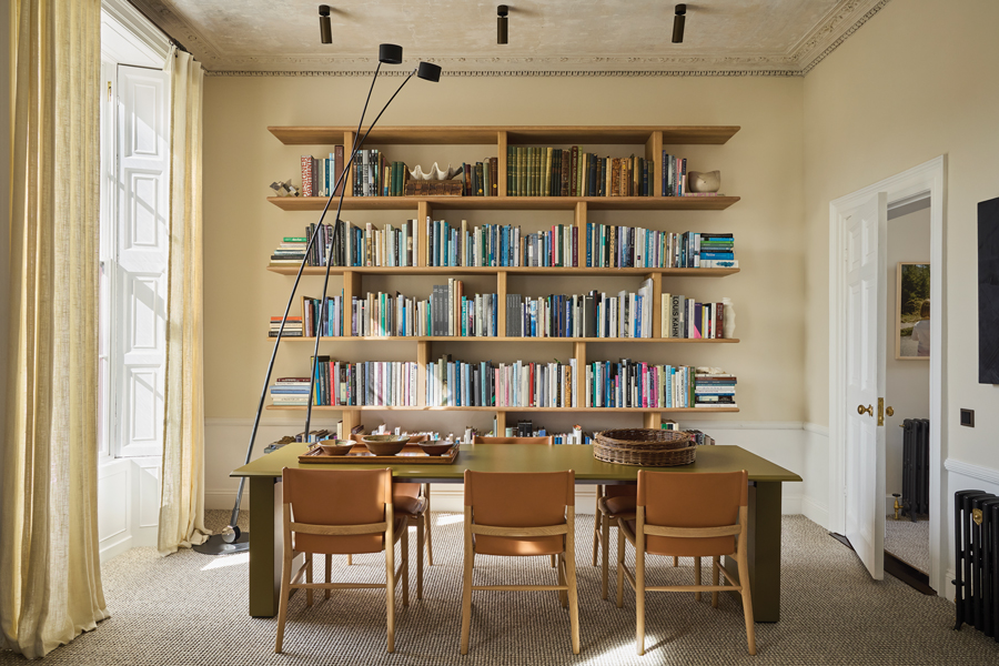 The dining room also serves as a boardroom or meeting room. By day, the table (by B&B Italia, at Minima) is lined up with the window to benefit from the south-facing light, while for dinner parties, the table is repositioned longitudinally in the room. The chairs, also by B&B Italia, are at Minima. The light is by Davide Groppi, at Minima. Unlined linen curtains (by Mary Wrynne) hang at the windows at both ends of the interconnecting rooms. The overscaled shelves were designed by John (and made by Knut Klimmek) to accommodate the couple’s large collection of design books. Throughout, there is a newly added chair rail, specified by John: “This would have been typical of the Georgian period and really helps with the proportions of the room.” The chair rail designates the height of the radiators and furniture, which are placed below it.