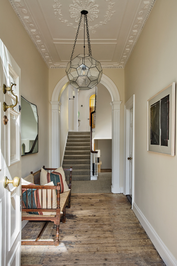 Both floor and ceiling in the entrance hall are untouched save for careful restoration and cleaning of the original floorboards and plasterwork. “The idea was to demarcate the area where visitors come in straight from the street,” says Eoin. The pendant is by Rose Uniacke. The wooden bench with straw seat is from London’s Lots Road Auctions. Beyond, the stairs leading to the return and the private living spaces is covered in a wool and sisal runner.