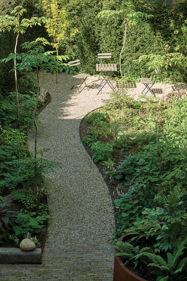 A view from the presentation room to the north-facing garden, which was planted with semitropical trees and shrubs by Bernard Hickie.“The plan is that it will become overgrown and enclosed and the meandering path will lead you into it.”