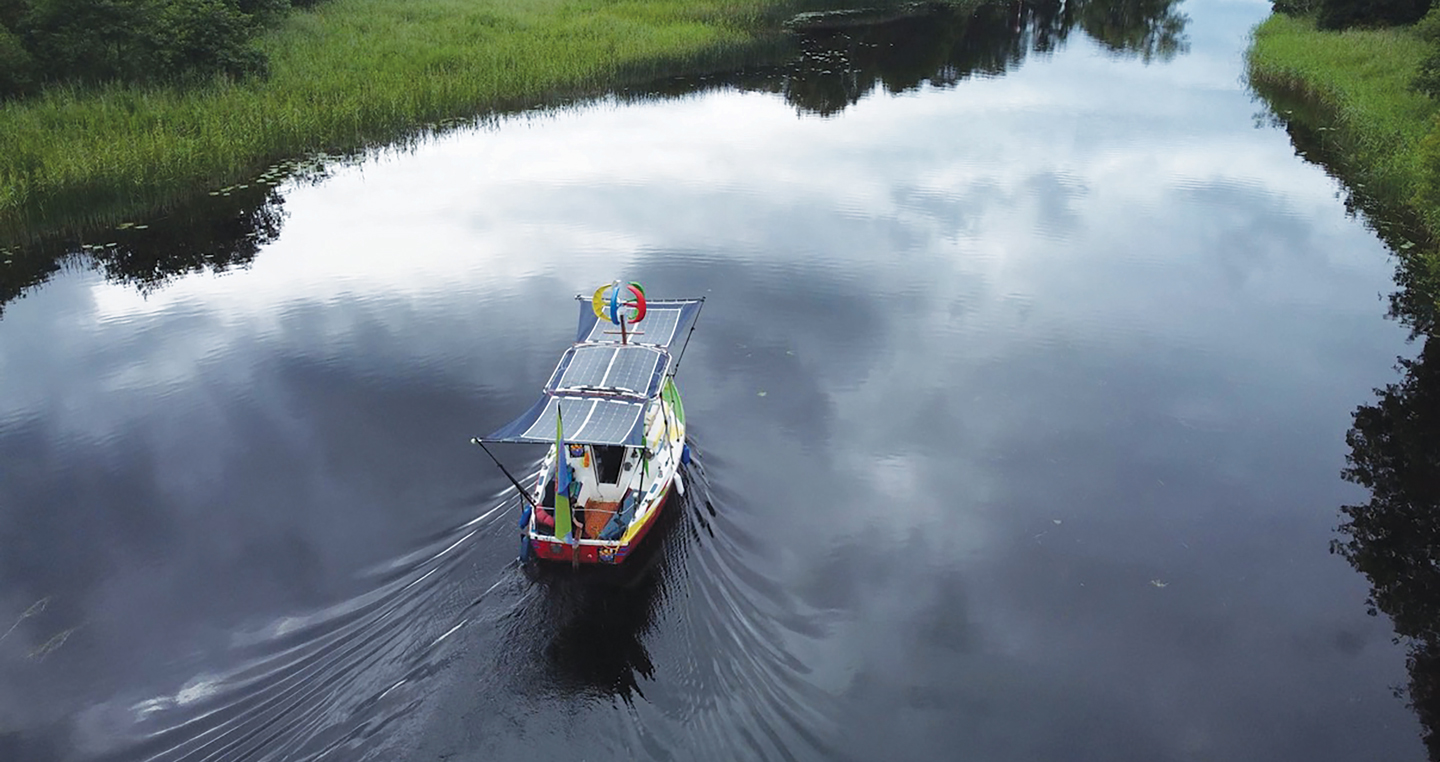 For some time now, I have been following the journey of a floating arts project that has been traversing Ireland’s waterways, bringing together artists and scientists to discuss, engage with, and attempt to combat climate change. Captained by artists Anne Cleary and Denis Connolly, the Eco Showboat, run on solar power, navigates our inland waterway systems to bring art installations, events, and invigorating discussions to towns across the country. “The aim is to travel the country sustainably to meet waterside communities, using the arts as a way of communicating with people on themes related to climate change, combined with a scientific programme to deepen knowledge of environmental issues,” Anne tells me. In 2022, thanks to a grant from the Arts Council, Anne and Denis embarked on a maiden voyage from Limerick to Enniskillen. “The essential idea was a slow-touring eco-art project,” Denis explains.