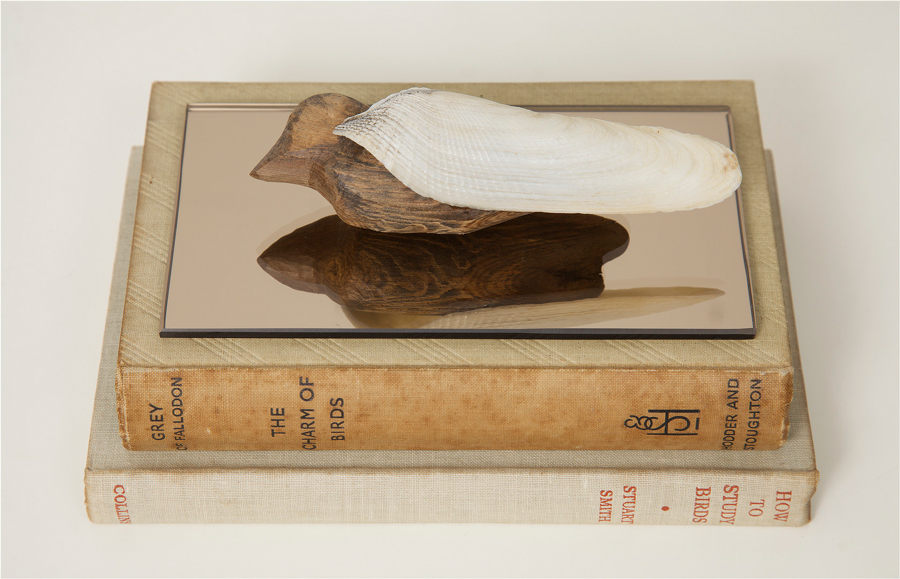 Home | Culture & Books | Artistic Licence: Bennie Reilly | Bennie-Reilly,-The-Charm-of-Birds,-carved-wood,-shell-fragment,-bronze-mirror,-books,-10-x-20-x-14cm,-2024_screen