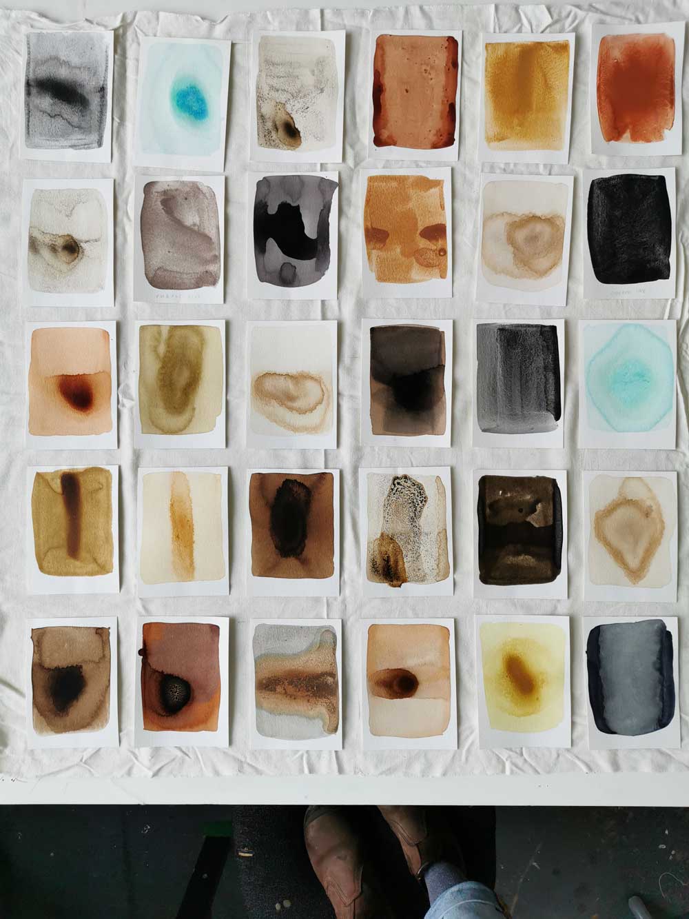 The colour packs respond to a specific area where I foraged colour. They’re really simple but have something really special about them. I like that people can choose how to display them, and the small postcard size makes them a great gift. My commissioning process is a very immersive experience, both for myself and the client. We begin with a conversation about their expectations and the landscape they want to capture. I then forage colour and create pigment, ink and paint from that environment and send the client an artwork with the colours laid out as swatches. From here I begin the experimentation phase – mixing colours, adding modifiers, layering textures on various different surfaces to see what kind of beautiful alchemic hues emerge. From this we plan the final piece, aspects like orientation, negative space and size really have to work with their space. Then the final piece is created using the experiments that resonate most with the client as the jumping off point. The finished painting emerges as colour is applied to the surface so the end result is revealed only on completion which keeps the process exciting.