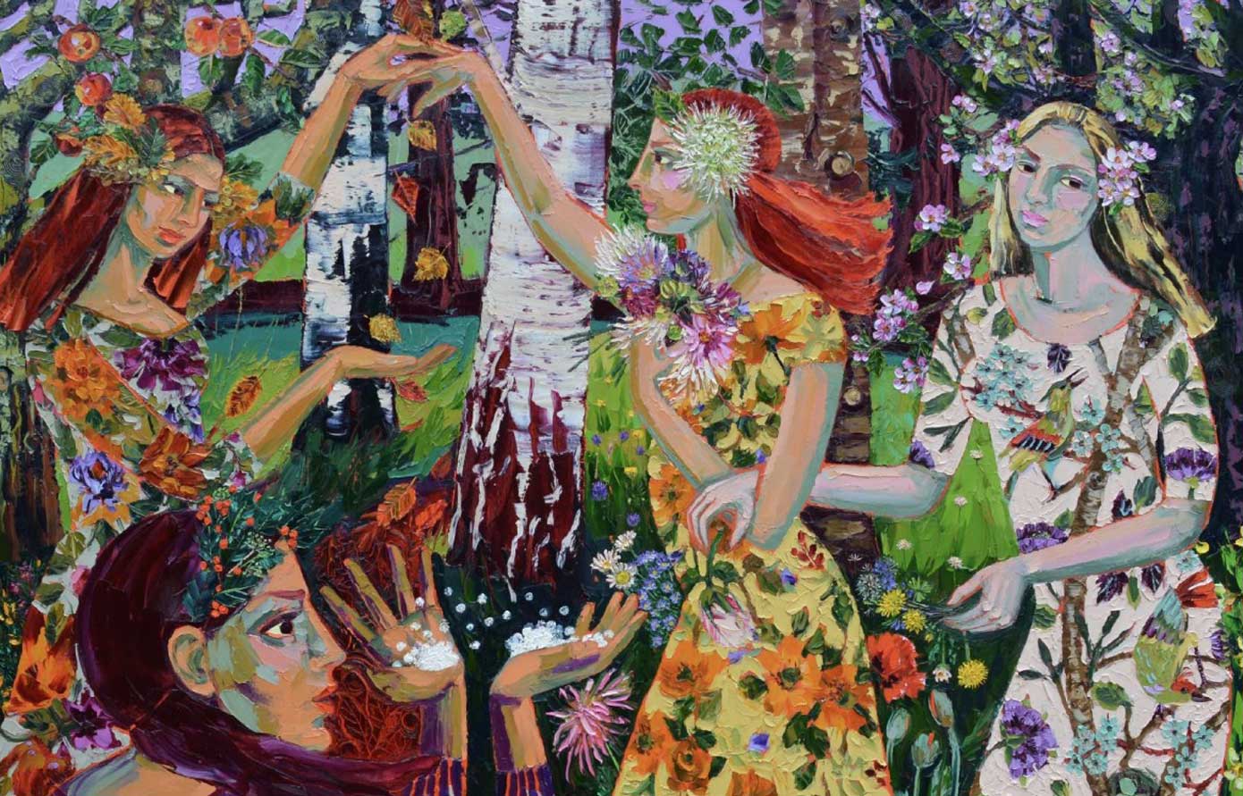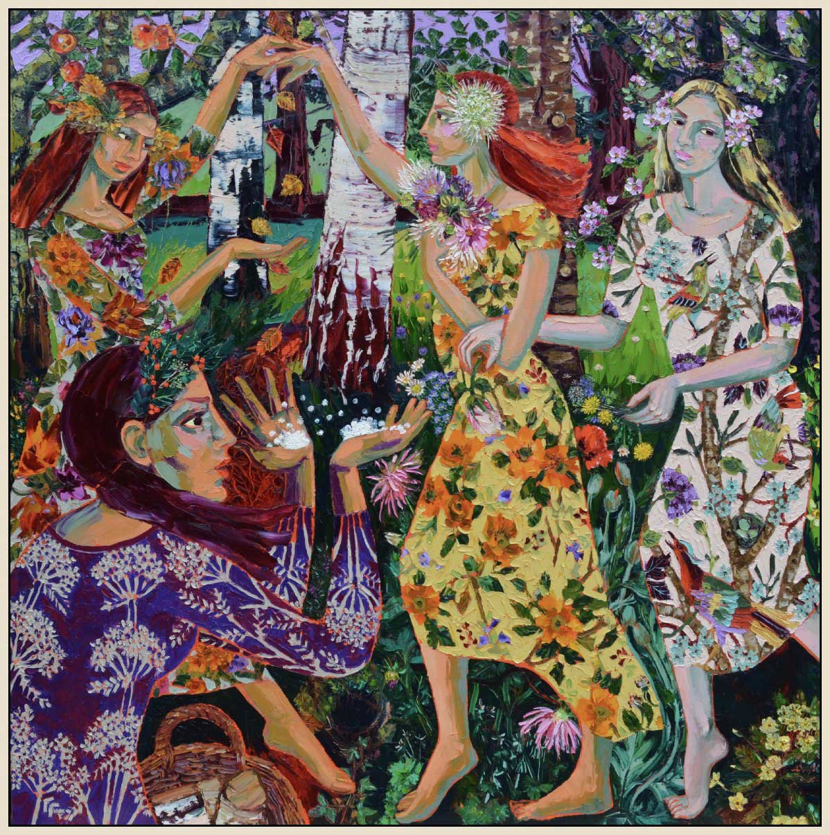 Yes, “Seasons” is the one big 6ft x 6ft painting. It is massive and took me months to resolve before I could say it was finished. I deliberately started this at the beginning of last autumn’s lockdown. It was to counteract the depressive negativism that I felt as the inevitable lockdown was approaching. I had to grow wings and fight that sadness and the feeling of impending chaos that so many people were trying to cope with, in my own way. I had to do something to dispel the darkness, so I embarked on this huge “Seasons” painting full of life, flowers and colour that represents what it is to be alive on this amazing planet of ours. I deliberately set out to daily share and post as much colour and positivity on my Instagram feed, just to help anyone out there that might be needing some colour therapy.