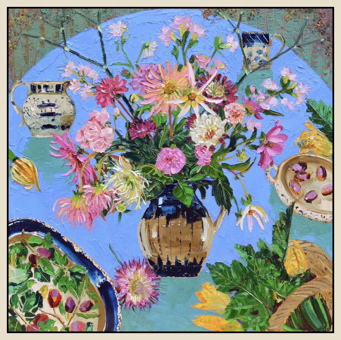 Yes, I adore painting flowers from my garden and every year I plant out more tulips bulbs and dahlia tubers to add to my flower beds, then watch them grow and bloom, waiting to gather them in to my studio to paint. I change my palette to match the mood I am in as I respond to the ever changing colours and weather in my garden. My new painting “Ode to Spring” is one such painting, where the excitement of seeing swathes of loud, all singing and dancing daffodils, triumphant against the blacks and plums of the over wintered soil, was just so impelling that I had to try to capture all that in paint.