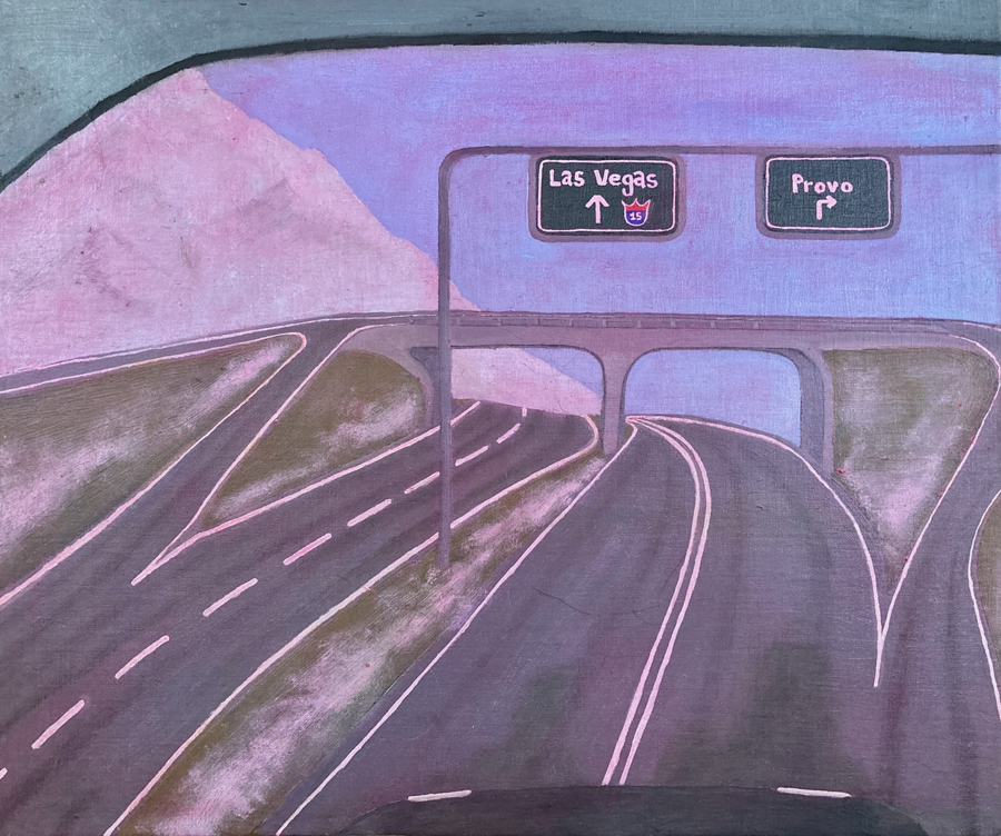 Loads, for example, For Mom, is when my mom and I met in Utah for a Hail Mary procedure, we drove from Salt Lake City to American Fork Utah in a rental car. Along the way a sign for Vegas was along the Highway and it of broke the ice on what strange measures we were taking to rid me of pain as I turned to her and said “Wanna go to Vegas?” – we both burst out laughing. That moment was full of hope for me, that the pain might go with the procedure to come, so I coated the scene in pink rather than the reality of what we saw of just the highway.
