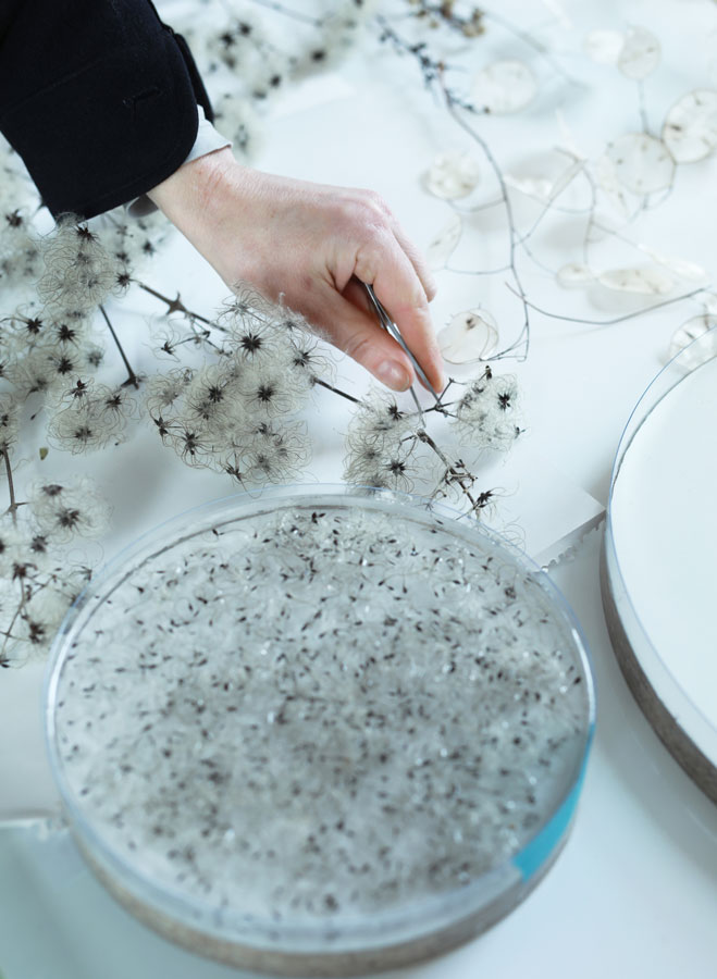 The plants come from a specific landscape that the piece is about, to have that literal connection. It could be seaweed from Galway Bay or grasses from the Liffey source. I’m currently working on a series about my mum’s garden, so I’ve been collecting lots of gorgeous flowers from her garden for the last three years.