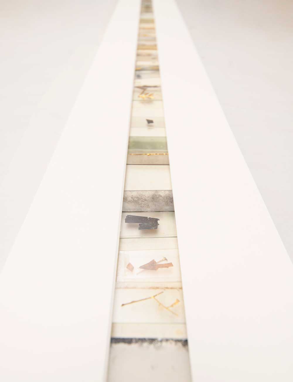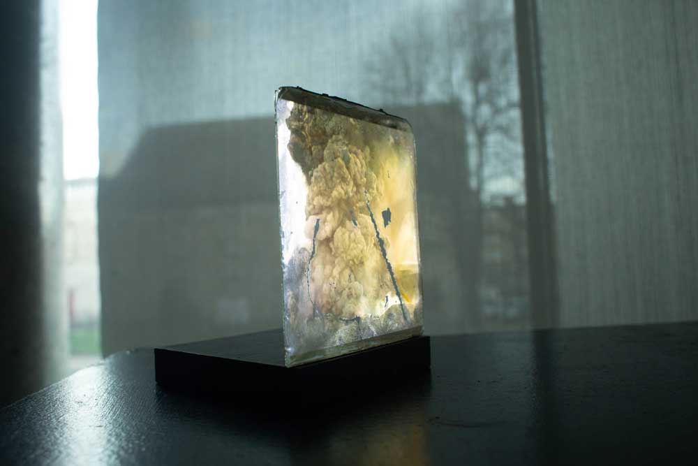 Breathe is a film that weaves together narratives of studies in human breath, medicine and plant remedies to explore the idea of coexistence in a world moved by invisible networks. The installation is about the importance of air and the coexistence between the lungs of the earth, humans and plants. It consists of a glass prism, volcanic ash, air particles, 24 karat gold and smoke. The work explores a selection of major European volcanoes and points to the cycle of the earth breathing within the carbon cycle. It was exhibited at Bozar in Brussels earlier this year. [Breathe was supported by The Dutchese Museum, Dresden for the exhibition “Of People and Plants,” with David Stalling, composer, and Christopher Ash, film editor.]