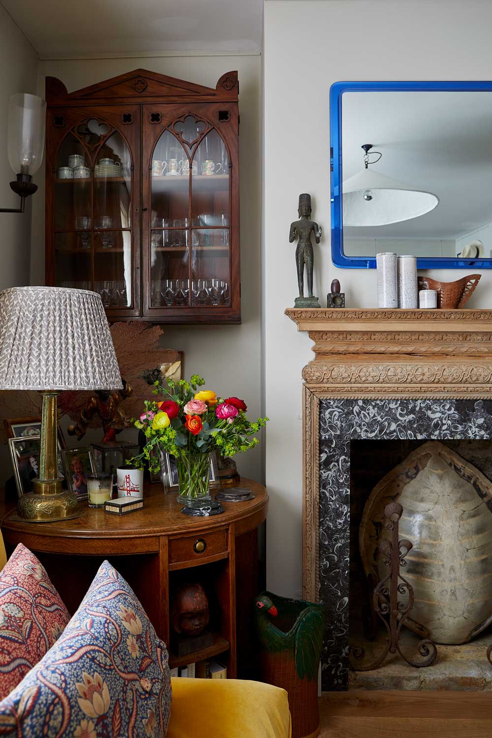 The children’s bedrooms are on the first floor. The toddler sleeps in a mini art gallery featuring a collection of works. “The big moth is by the wonderful Sarah Graham, a family friend and botanical artist who does everything on an enormous scale. The Regency Gillows mahogany chest of drawers works very well with our wall-mounted English Regency cabinet with its original wobbly glass which I’ve had for a long time. The oxen are from Sri Lanka – probably the second thing Celia and I bought together. They are Nandi bulls.”