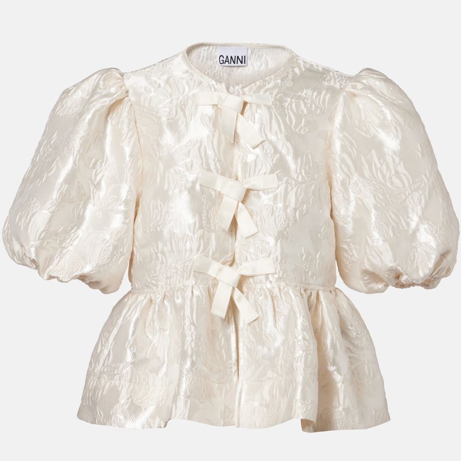 The trend for bow-detail tops is going nowhere. Update yours with this peplum style in festive-appropriate jacquard. White satin blouse, Ganni, €265; www.mytheresa.com.