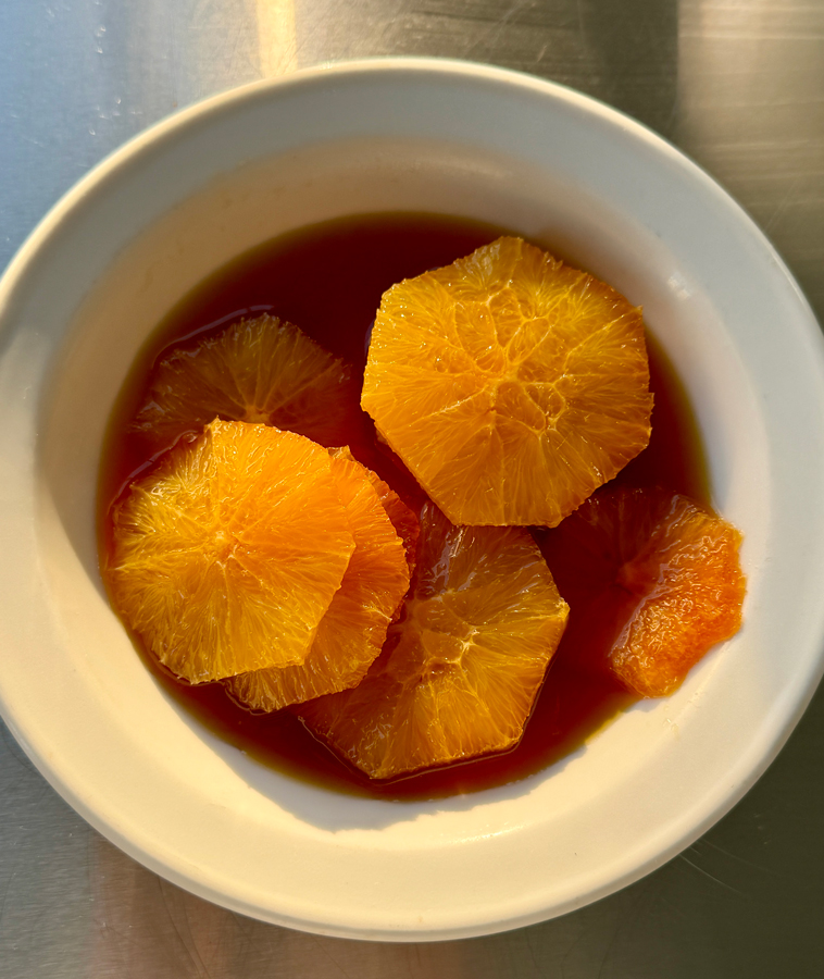 3. Slice the top and bottom off the oranges so they sit flat. Using a sharp knife, remove the peel and white pith in strips from top to bottom. Cut the flesh into neat 1/2cm slices. Place the slices in a bowl and pour over the cooled caramel. Cover and leave for about 30 minutes before serving.