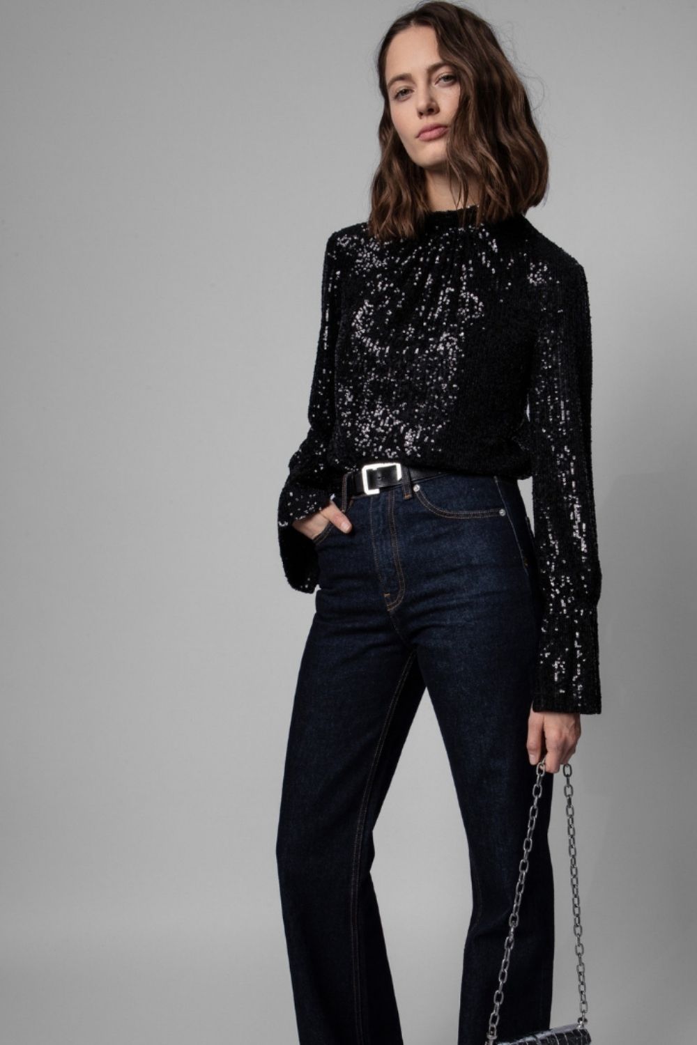 The cardinal rule of lazy dressing? Throw. A. Sequin. At. It. That old classic of jeans and a nice top is popular for a reason. This Zadig & Voltaire top, €395 at Costume, looks perfect with denims.