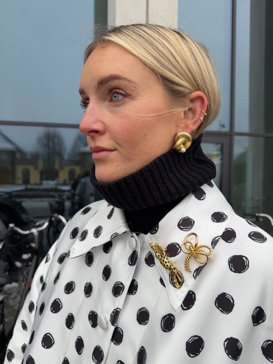 We’ll always gravitate towards a polka dot as it’s the kind of classic print, much like leopard, that is so easy-to-wear it practically has neutral status. This striking hand-drawn printed coat, pictured above, is by Sister Jane (find the brand at Brown Thomas and Arnotts); we love how it’s given a bit of personality with some gold brooches.