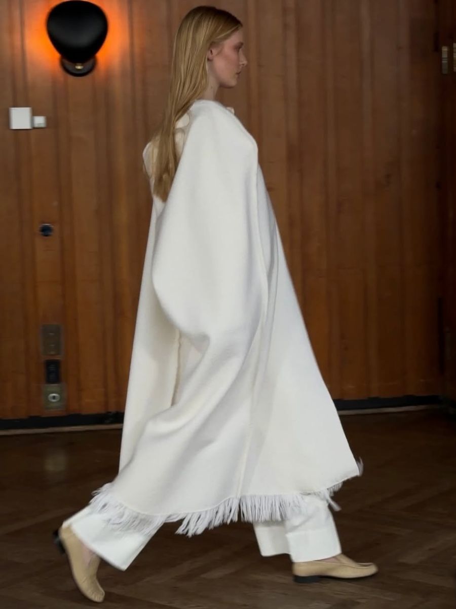 The Garment is a Copenhagen brand that’s been on our radar for a while thanks to its streamlined collections which support your capsule wardrobe. (Read an interview with creative director Charlotte Eskildsen here.) For AW26, the collection revolved around cream and black: a colour combination that’s endlessly chic. This cream fringe-trim cape ranks highly on our lust-list for next autumn.