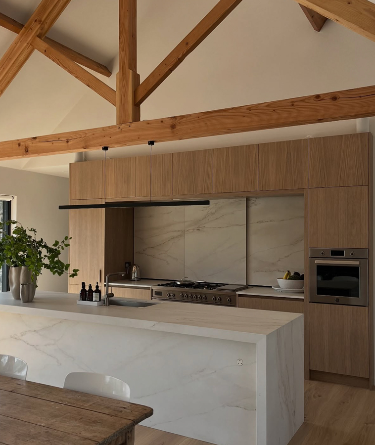 Farmhouse-style kitchens are known for their welcoming warmth. Exposed wooden beams are a key feature to achieve this rustic feel, which is cleverly contrasted against this minimal kitchen. If you have an angled roof and are considering the look, take inspiration from this modern barnhouse. @noeldempseydesign
