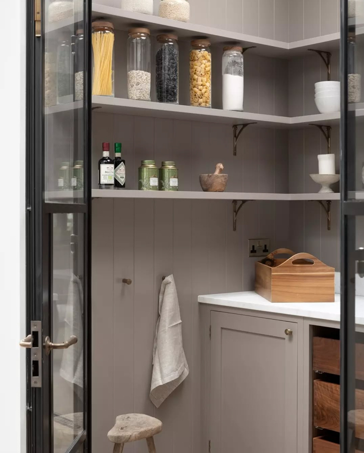 Walk-in pantries are becoming increasingly popular again, if you have the luxury. They’re indispensable for storage, organisation and to display homeware. The crittall door is an added design feature here, while the natural panelling and tall shelves are functional and stylish. @porterandjones
