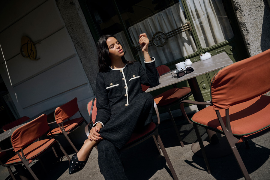 One of the collection’s most refined notes is tonal tailoring: easy to wear, endlessly versatile, and quietly luxe. Co-ords are the epitome of this idea – a sophisticated check that suggests country club chic, or a chocolate suedette set that is both laid-back and sophisticated. The ability to wear these sets together or as separates multiplies their value, making them true wardrobe investments. Layer with argyle knitwear in caramel tones for a preppy twist, or contrast with dark-wash denim for a streetwise finish.