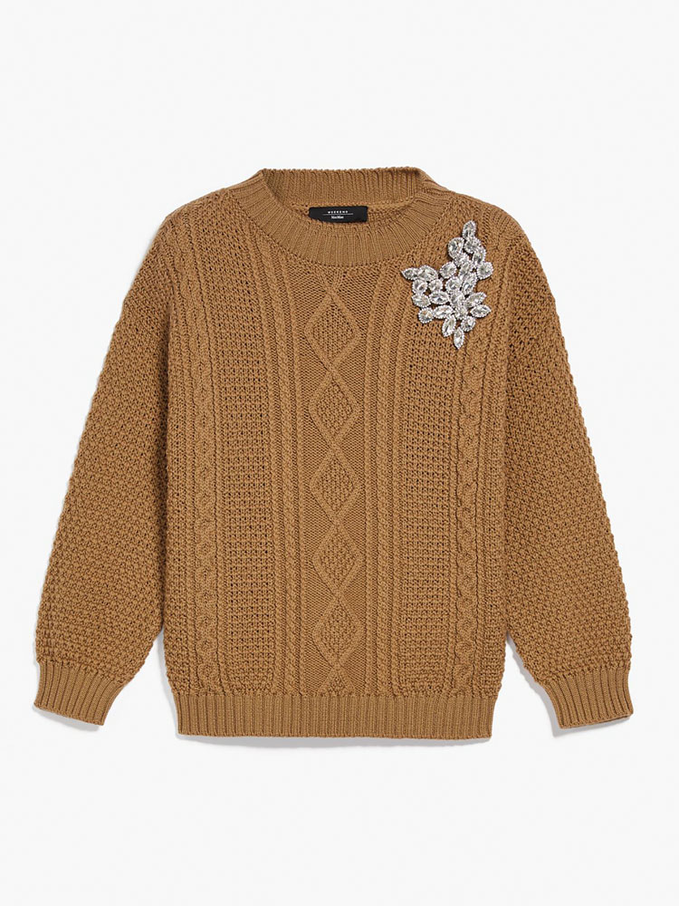 Camel cable-knit wool sweater with detachable brooch, Weekend Max Mara, €219, at Brown Thomas.