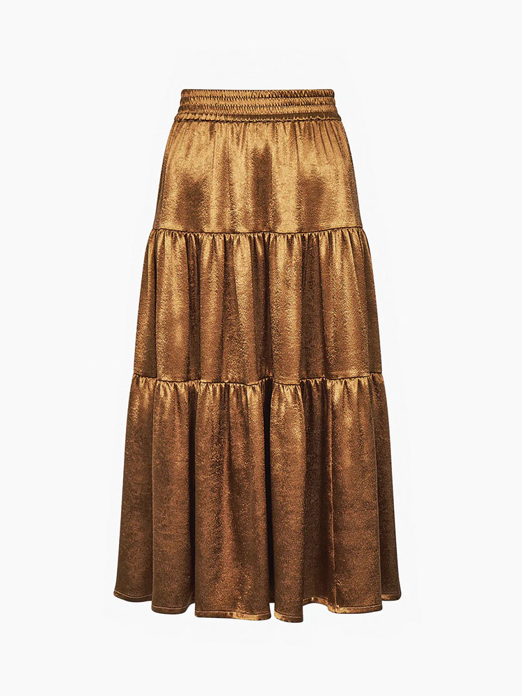 Gold Denney Inu satin midi skirt, €75, at French Connection, Powerscourt Centre, 59 South William Street, Dublin 2.