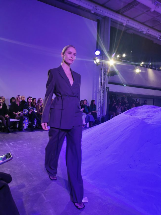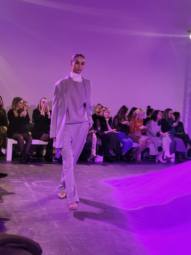 Roksanda’s suit, made from a flecked grey jersey fabric, was worn with a sweatshirt underneath and a thick white jersey roll neck under that. Comfortable and chic when paired with Malone Soulier nude kitten heels.
