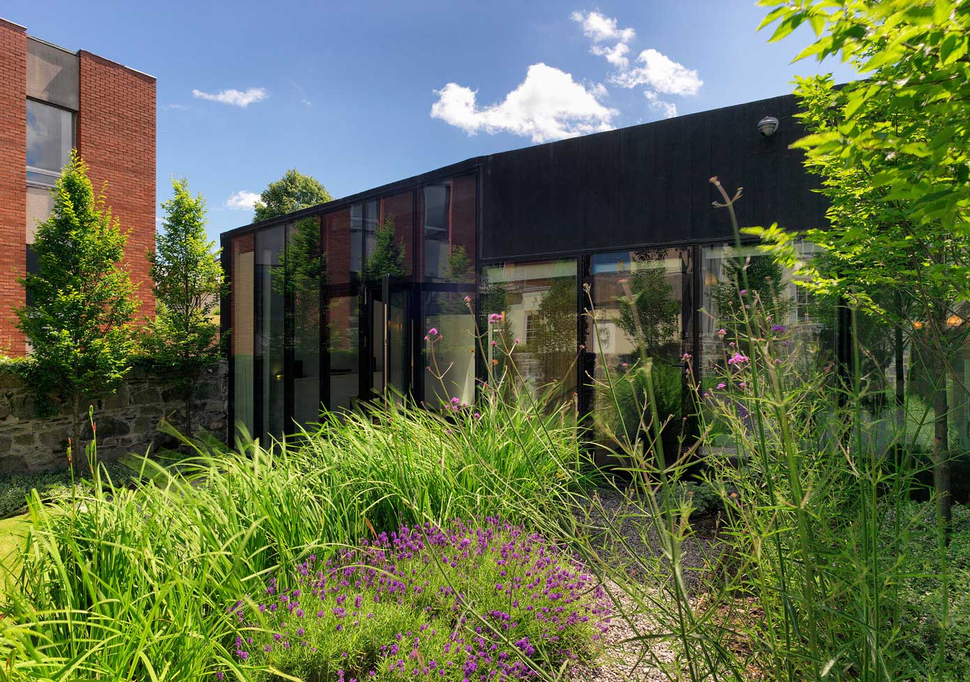 While each of the outdoor spaces serves a distinct function, they are all unified in their common elements of hardscaping and plant material. The front courtyard doubles as a much-needed parking area and features simple plantings that contrast nicely with the bold character of the building’s exterior.