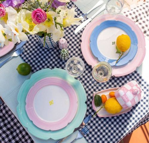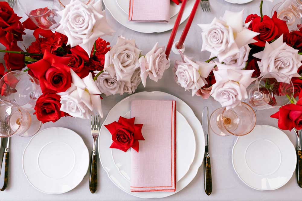 Tara O’Connor, founder of The Designed Table, is also a fan of this colour combination. “You don’t need to cover your table in pink or red to create a romantic spread. A few carefully chosen accents — like a vase of roses, a handwritten menu, and rose-tinted glassware — will work without all the extra fuss.” To achieve this look, The Designed Table’s linen and cotton Pantone Collection is perfect. “Our Rose Pink and Candy Red collections work beautifully together. Finish with a Red Bow or Gold Leaf napkin ring and you’ve got a table set for old-fashioned romance,” explains Tara; www.thedesignedtable.com.