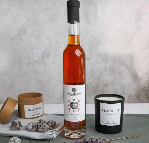 Ice, wine, chill box (Killahora Rare Apple Ice wine, Somas Black Fig and Vetiver candle, Neary Nogs whiskey truffles), €80, at Evenstone