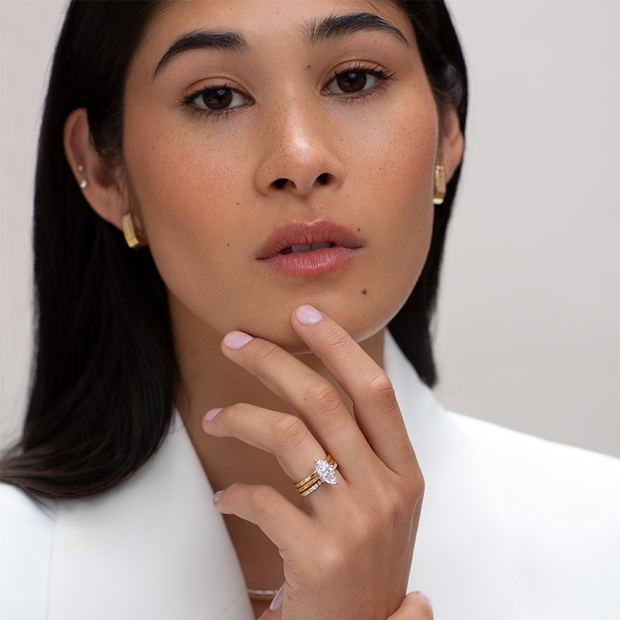Home | Fashion | Glossy Gifts That Sparkle This Season | holder—ENGAGEMENT-IMAGE-—-NEWSLETTER.-18ct-1.70ct-Marquise-Cut-Diamond-Ring-€2700.-18ct-Gold-Wedding-Band.-14ct-Ridged-Chunky-Oval-Hoop-Earrings-€575