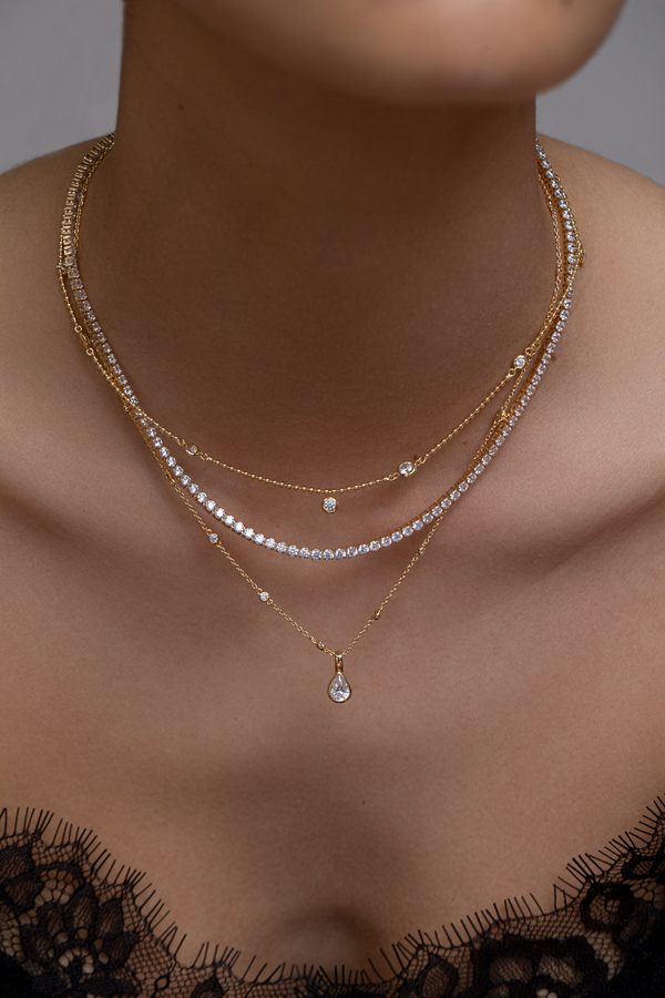 Home | Fashion | Glossy Gifts That Sparkle This Season | TOP-TO-BOTTOM.-Gold-CZ-Charm-Necklace-€255.-Gold-Tennis-Necklace-€240.-Gold-Pear-Cut-Glitter-Pendant-€290