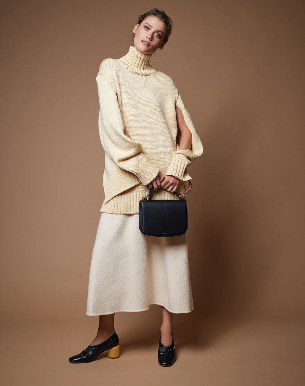 Vanilla cashmere-mix cape-style sweater, €895; cream wool skirt, €695; black leather bag; all Jil Sander, at SAMUI, 17 Drawbridge Street, Cork; www.samuicork.com.