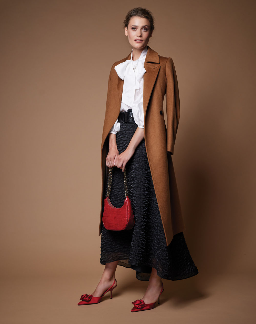 Copper wool-mix coat, €420, Hobbs; red satin slingback shoes, €59.95; red faux croc bag, €29.95; both Zara; all at DUNDRUM TOWN CENTRE, Dublin 16; www.dundrum.ie. White cotton voile tie-bow blouse, €325; black organza bubble skirt, €650; both AndTate; www.andtate.com.
