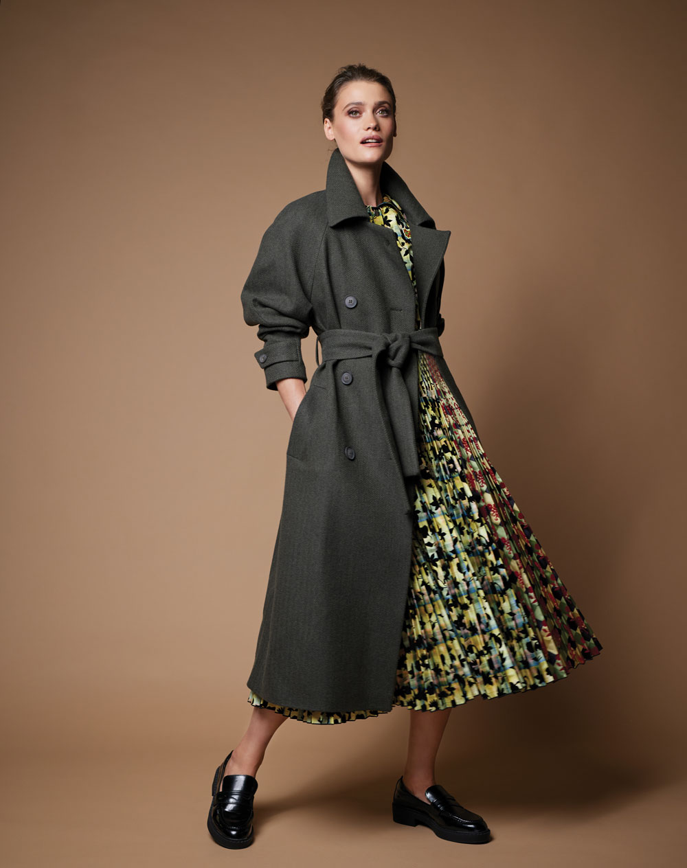 Olive green wool belted coat, The Landskein, €950; multicoloured pleated dress with belted waist, Chopova Lowena, €1,670; both at HAVANA, Donnybrook, Dublin 4; www.havanaboutique.ie. Black leather loafers, €70, at Marks & Spencer.