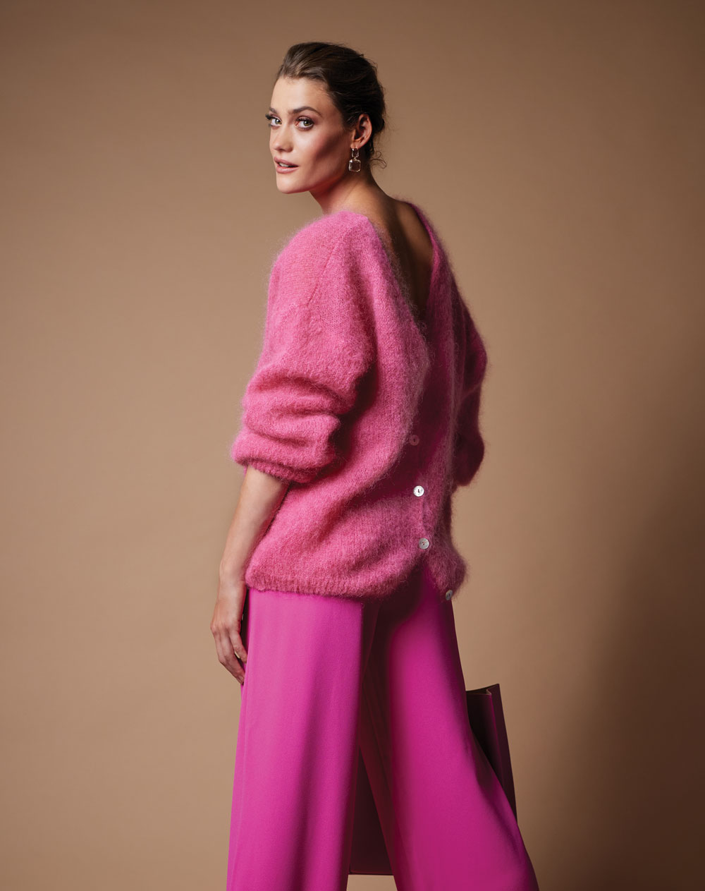 Cerise mohair cardigan, American Dreams, €190; cerise trousers, Selected Femme, €79.99; pink leather shopping bag, €295, By Peelo; crystal earrings, Last True Angel, €17.95; all at AVOCA; www.avoca.com.