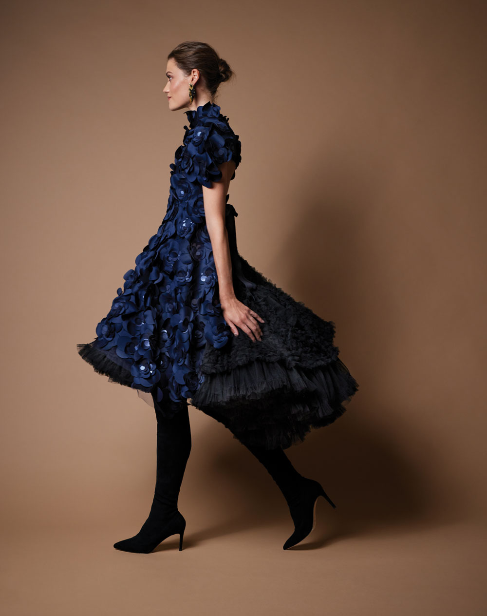 Navy couture laser-cut multi-disc corseted dress and capelet, price on request, at HELEN CODY; @helencodydublin. Black suede boots, €650, at LK Bennett. Feathered bird earrings, Mignonne Gavigan, €166, Loulerie, at Curated by Design Centre, Kildare Village, Co Kildare.