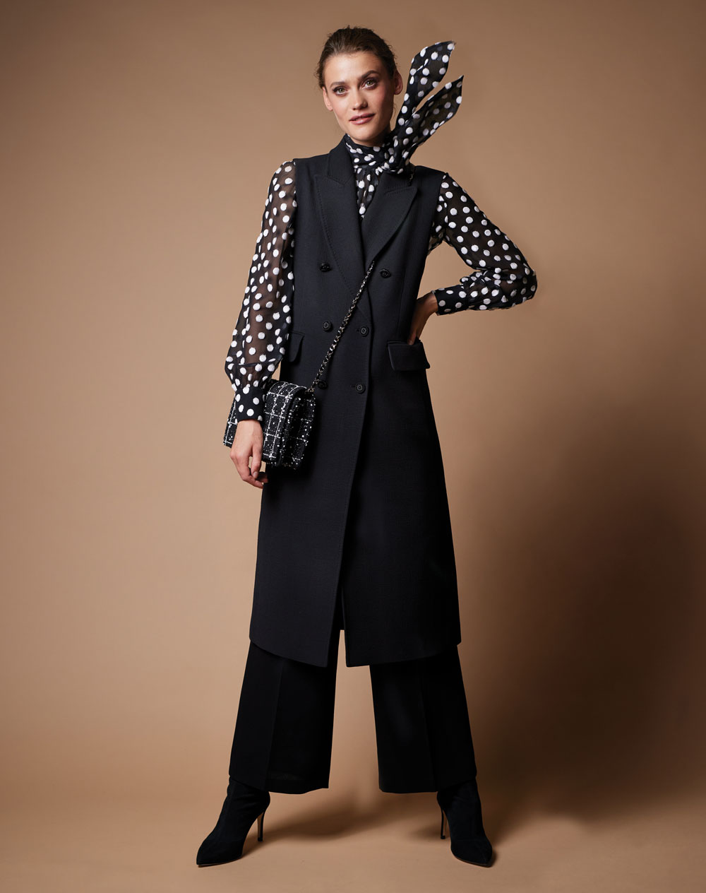 Black Anna sleeveless waistcoat, €1,395; black Rae cropped trousers, €695; polka-dot silk blouse, to order; tweed Louise crossbody bag, €1,995; all at LOUISE KENNEDY, 56 Merrion Square, Dublin 2; www.louisekennedy.com. Black suede boots, €650, at LK Bennett, Dundrum Town Centre, Dublin 16.