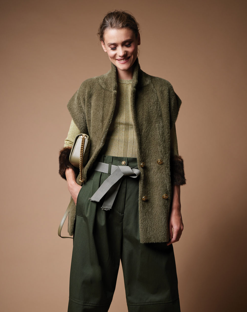 Khaki textured gilet, €325; gold top with faux fur cuffs, €195; khaki high-waisted trousers, €250; sage leather bag, €365; all Pinko at Harvey Nichols, DUNDRUM TOWN CENTRE, Dublin 16; www.dundrum.ie.