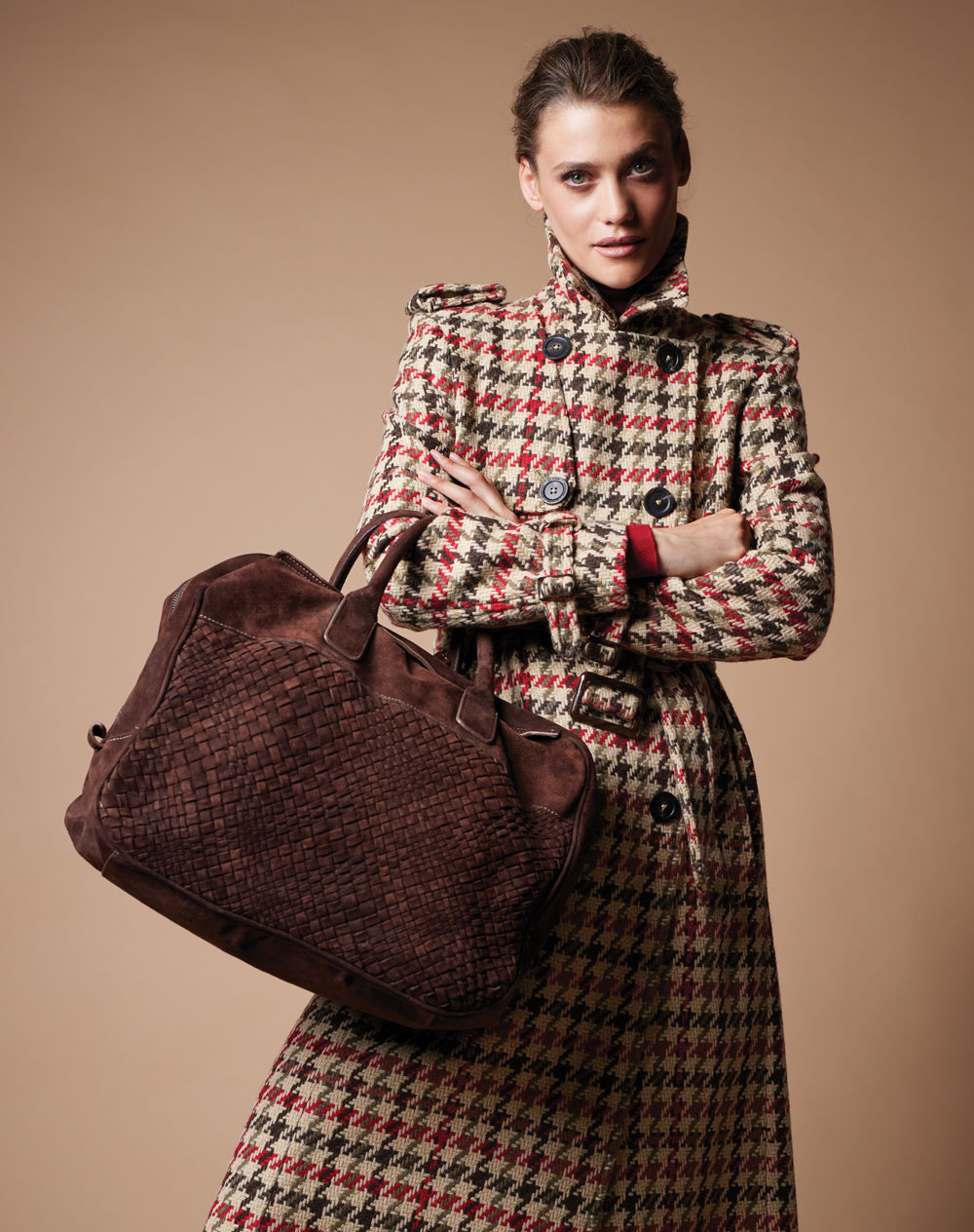 Camel and red check tweed wool coat, €879; red wool polo-neck sweater, €119; both Johnstons of Elgin; chocolate suede tote bag, Eleventy, €663; all at KILDARE VILLAGE, Co Kildare; www.kildarevillage.ie.