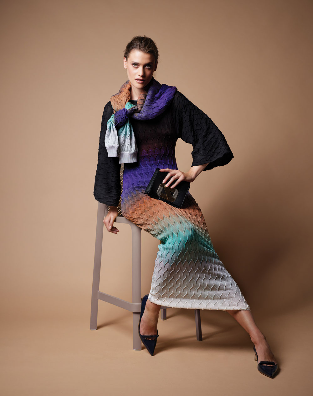 Multicoloured knit dress, €550; matching knit sweater, €485; black leather bag, €495; all Missoni; navy patent-leather shoes, €305, LK Bennett; all at KILDARE VILLAGE, Co Kildare; www.kildarevillage.ie. Faro resin stool, €96; www.pieces.ie.