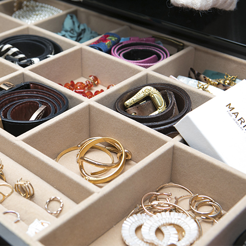 I made sure to introduce lots of different types of storage when building the wardrobe. The jewellery display is genius because I can see everything clearly now. Before, I had lots of boxes full of things and it was chaotic. Necklaces getting tangled! Never able to find anything! The drawers have enough space that I can lay everything out. I have a lot of knitwear and cashmere and was advised that a breathable drawer would be best for these, so we opted to include some perforated drawers.
