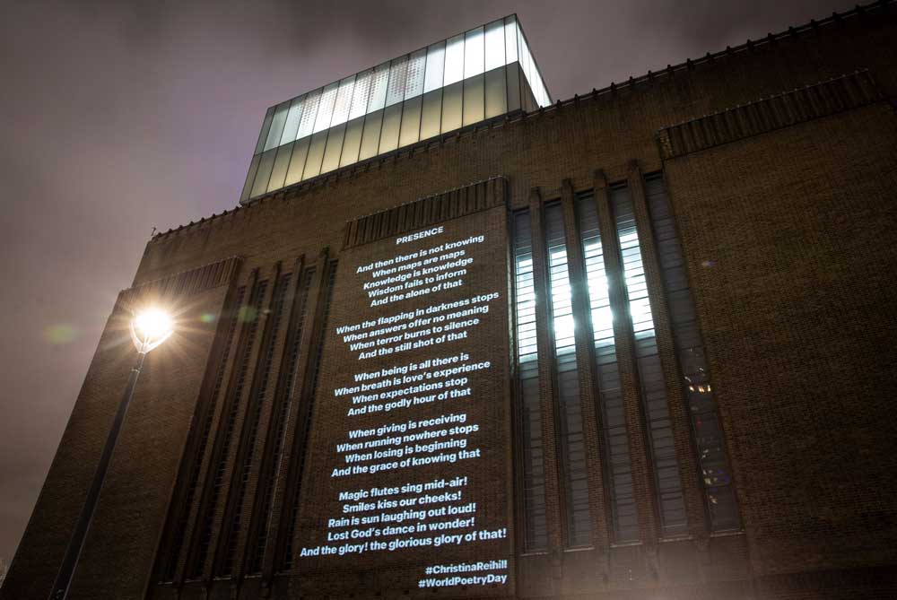 According to UNESCO, World Poetry Day on Sunday March 21, is meant to encourage “a return to the oral tradition of poetry recitals, to promote the teaching of poetry to support small publishers and create an attractive image of poetry in the media, so that poetry will no longer be considered an outdated form of art, but one which enables society as a whole to regain and assert its identity.” To mark the occasion Irish artist Christina Reihill (a former Vogue staffer) is presenting “Presence”, a public projection of her latest poetic work on empty buildings in London including the Tate Modern, the Royal Opera House, and Royal Festival Hall, South Bank.