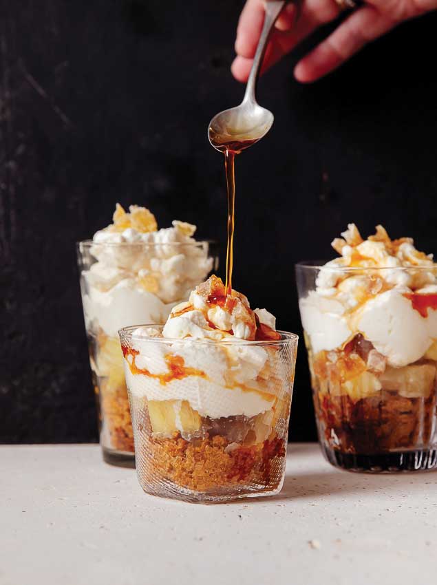 To assemble the trifles, crumble the gingerbread into some pretty tumblers or glasses. Spoon in the pineapple, pouring the syrup in so it soaks the gingerbread. Crumble the chestnuts over the fruit then top with the whipped cream.